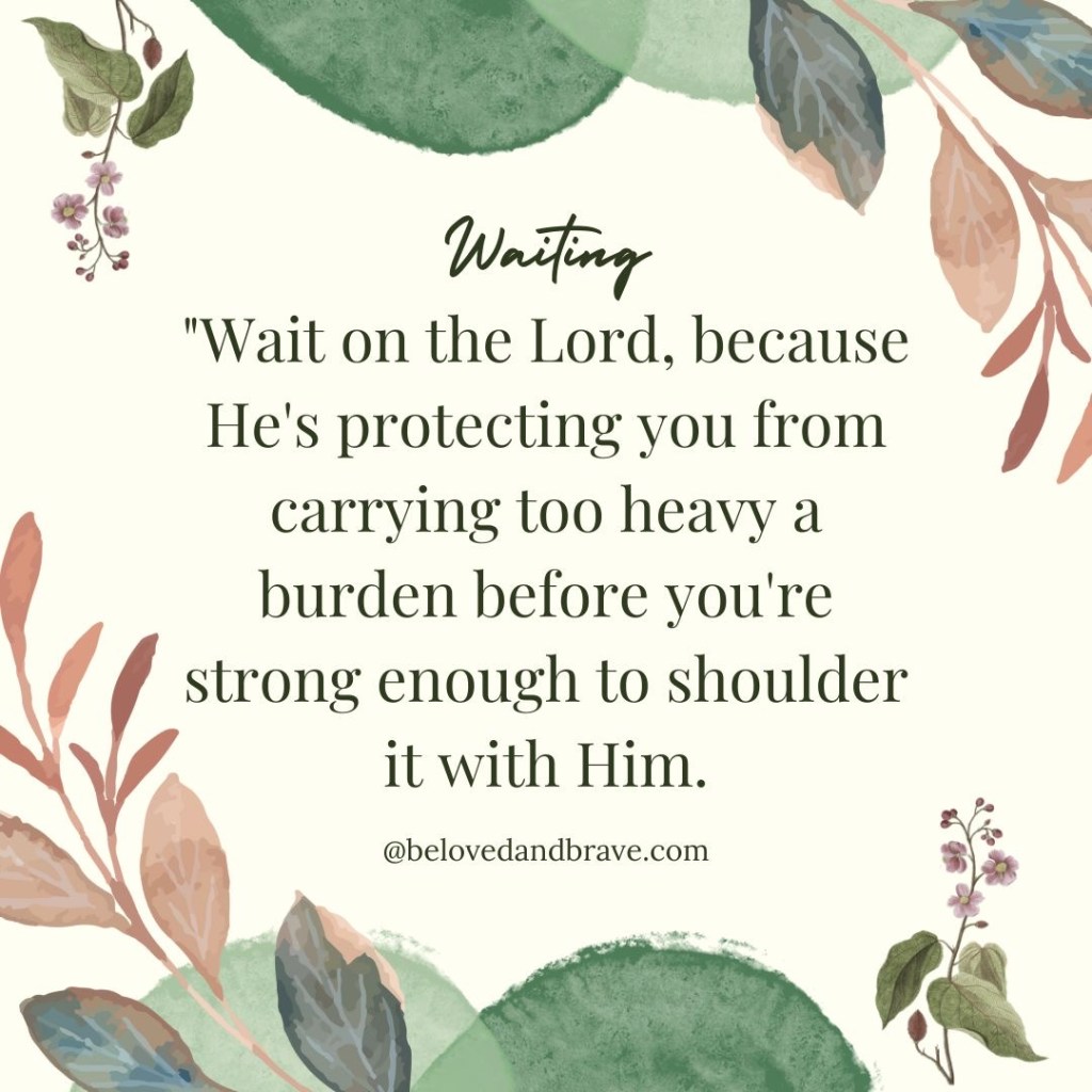 Here’s what actually happens: God gives us a promise, a word to hold onto in faith. We begin to pray for that thing to happen in joyful expectation. But instead of bringing it too soon, God brings us nearer to Him. We get disappointed, disillusioned. We have to work through being angry at God, and a lot of sin and character issues come up in us that we then have to confess and repent to God. He transforms and heals us, one day at a time, one hurt at a time, one issue at a time. We start to realize His presence is the promise and the gift, and even though we can still hold on to the word He gave us, when we pray, we pray for it to happen according to His will, in His timing. We recognize that we weren’t ready for that promise when He gave it. He continues to work on our healing and growth as we come to Him with each new hope, fear, hurt… eventually we start to pray, that even if that thing never happens, we will trust Him because we know who He is and we are submitted to Him. We are confident in His love and kindness to us. He is more to us than the thing He promised. We actually believe that what He is doing in and through our lives is for our good and His glory.